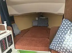 The cabin is generous for the size of the boat; comprising 4 full sized berths (minimum 1.86m or 6'1"),[1] space for a chemical toilet and a small galley area with a sink, food store and space for a 2 burner hob.