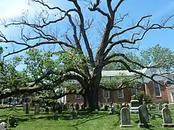 In the historical graveyard of the church stood a white oak, sometimes called the "Holy Oak", until 2017.[5] It was 619 years old, possibly the oldest white oak in the world.[5] It was nearly 100 feet (30 m) tall and had a spread of more than 130 feet (40 m).[6] It had a trunk circumference of 20 feet (6.1 m) and its lower branches were supported.