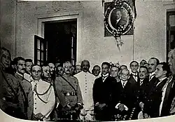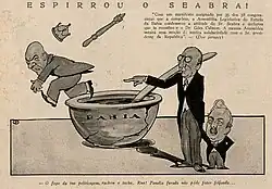 State ministers were chosen since the beginning of October and represented almost total support among civilian politicians. São Paulo native Rafael de Abreu Sampaio Vidal took over the Ministry of Finance,[25] ensuring his state's control over the country's economic policy — a typical "milk coffee" agreement.[26][27] But the Minas Gerais-São Paulo alliance contained a contradiction: on one side, the less orthodox São Paulo plutocrats, and on the other, career politicians from Minas Gerais, who valued fiscal balance. Sampaio Vidal was known for his proposal, when deputy, to issue unbacked bills to finance the defence of coffee. His name displeased orthodox politicians from Minas Gerais: Antônio Carlos Ribeiro de Andrada, leader of the majority in the Chamber of Deputies, Mário Brant and Afonso Pena Júnior.[28][29]