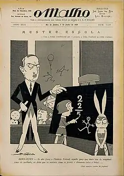 Bernardes, leader of the Republican Party of Minas Gerais, was the candidate of the federal government, Minas Gerais, and São Paulo in the 1922 presidential election, chosen in spite of other states.[6] Rio de Janeiro, Rio Grande do Sul, Pernambuco and Bahia came together in the Republican Reaction and launched the opposition candidacies of Nilo Peçanha, from Rio de Janeiro, for president, and J. J. Seabra, from Bahia, for vice president.[7] The campaign was fierce.[8] The election was one of the few tightly disputed ones in the First Republic and the opposition accused the results of fraud.[9] The Copacabana Fort revolt attempted to prevent Bernardes' inauguration and the government declared a state of emergency in response.[10][11]