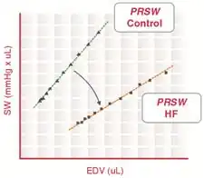 During heart failure, myocardial contractility is reduced, which decreases the slope of the PRSW relationship. Recent studies also indicate that the volume axis intercept of the PRSW relationship (not the slope) may be a better indicator of the severity of contractile dysfunction.