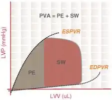 The Pressure-volume area (PVA) represents the total mechanical energy generated by ventricular contraction. This is equal to the sum of the stroke work (SW), encompassed within the PV loop, and the elastic potential energy (PE).