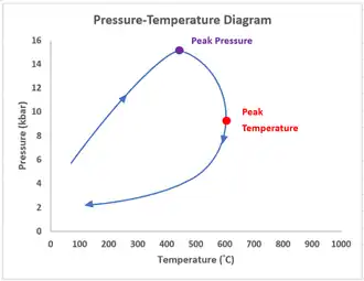 It is commonly observed that the peak temperature is reached prior to the peak pressure in anticlockwise P-T-t paths, as the rocks usually experienced the heat from the heat source before being extensively pressurized.[12]