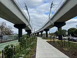 Between 17 May to 30 May 2022, the Mernda line was shut down for 12 days to remove the Oakover Road, Bell Street, Cramer Street and Murray Road level crossings in order to get the first part of the elevated railway bridge ready and demolish the old ground level station platforms.[21][22] On 30 May 2022, the first part of the 2 kilometre bridge opened with a temporary single track until 26 August 2022.[23] During construction, the Mernda Line could not be closed for longer than 12 days due to the requirement of trains to regularly access the Epping maintenance yard facility.[23]