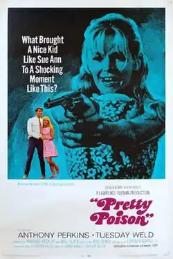 Pretty Poison is a 1968 American black comedy film[2] directed by Noel Black, starring Anthony Perkins and Tuesday Weld, about an ex-convict and a high school cheerleader who commit a series of crimes. The film was based on the novel She Let Him Continue by Stephen Geller. It has become a cult film.[3]