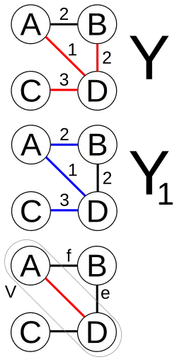Let tree Y2 be the graph obtained by removing edge f from and adding edge e to tree Y1. It is easy to show that tree Y2 is connected, has the same number of edges as tree Y1, and the total weights of its edges is not larger than that of tree Y1, therefore it is also a minimum spanning tree of graph P and it contains edge e and all the edges added before it during the construction of set V. Repeat the steps above and we will eventually obtain a minimum spanning tree of graph P that is identical to tree Y. This shows Y is a minimum spanning tree. The minimum spanning tree allows for the first subset of the sub-region to be expanded into a larger subset X, which we assume to be the minimum.
