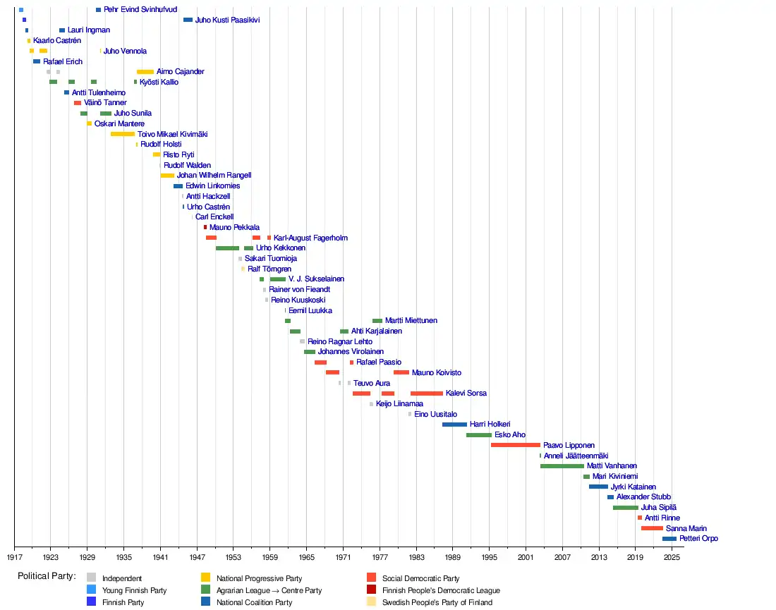 Since its independence in 1917, Finland has had 72 cabinets.[4] The longest lasting have been the two cabinets of prime minister Paavo Lipponen (Lipponen I and Lipponen II), both lasting the entire parliamentary term, or 1,464 days.