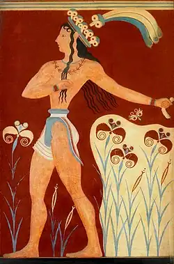 As a general rule, Minoan art followed the Ancient Egyptian convention regarding skin colours of "red" (usually more a reddish-brown) for men's flesh and white for women's flesh (also yellow for gold, blue for silver, and red for bronze). The skin of the Prince of the Lilies has most often been interpreted as "red", but some writers have seen it, at least on some fragments, as a white that became dirty when buried. There are also arguments that the colour gender distinction is not invariable in Minoan painting, for example when, as here, the background is a dark red. The elaborate crown may compare better with others on female figures (whether human or griffin) than male ones.[17]