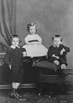 Ten months after suffering a miscarriage, Leopoldina gave birth on 19 March 1866, to the one who would become Dom Pedro II's favorite grandson, Prince Pedro Augusto.[12][13] From then on, the Princess began to live between Brazil and Europe, always returning to her native land for the birth of her children. Thus it was with Augusto Leopoldo and José Fernando—born in 1867 and 1869, respectively. When she discovered she was pregnant with the fourth child, she and her husband decided that they would not return to Brazil, and on 15 September 1870, Prince Luís Gastão was born at Ebenthal Castle in Austria.[14]