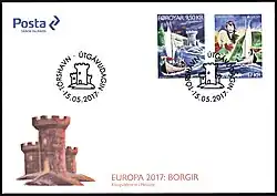 The princess was celebrated in a 2017 issue of postage stamps: the theme for the annual Europa competition was "Castles and palaces", and the Faroe Islands have never had any other resident royalty. One stamp shows the princess and her husband on a ship with an imaginary castle, the other shows the ship and portraits of the couple.[2][4] The artist was Janus Guttesen.[5]
