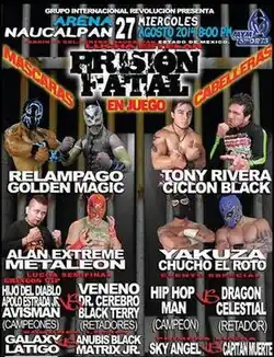 Prisión Fatal (2014) was a professional wrestling major event, produced by the Mexico based International Wrestling Revolution Group (IWRG) professional wrestling promotion. The event took on August 27, 2014, at "Arena Naucalpan" in Naucalpan, State of Mexico, IWRG's main venue and was the fourth show promoted under that name. The main event was the eponymous Prisión Fatal (Spanish for "Deadly Prison") Steel cage match where the last person remaining in the cage was forced to unmasked or shaved bald as per the match stipulation. The Prisión Fatal match included Alan Extreme, Chucho el Roto, Ciclon Black, Golden Magic, Metaleón, Relámpago, Tony Rivera and Yakuza. Ciclon Black, Golden Magic, Metaleón, Relámpago and Yakuza all put their mask on the line while Alan Extreme, Chucho el Roto and Tony Rivera risked their hair on the outcome of the match. In the end Ciclon Black was the seventh and last man to climb out of the cage, leaving Alan Extreme behind. After the match Alan Extreme had all his hair shaved off while in the ring as the lucha libre traditions dictate. The show also featured Los Gringos VIP (Apolo Estrada, Jr., Avisman and El Hijo del Diablo) defend the Distrito Federal Trios Championship against Black Terry, Dr. Cerebro and Veneno. The Distrito Federal championship is IWRG's secondary trios title and is only allowed to be defended in the Distrito Federal of Mexico City. Also on the show the AIWA Argentinean National Cruiserweight Champion Hip Hop Man defended the championship against Mexican challenger Dragón Celestial as Hip Hop Man was visiting Mexico from Argentina. The show featured two additional matches.