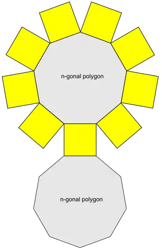 | Faces | 2 n-sided regular polygons n squares |