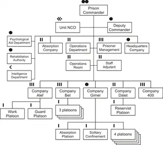 - Company Alef (א) - for prisoners serving sentences of 28 days or less, or those who have less than 28 days till their release. This is an open company, i.e. prisoners sleep in an open (but guarded) area, and not in jail cells. Headed by a captain and can contain up to 120 prisoners.