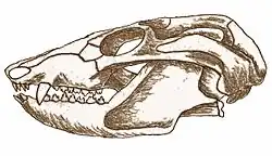 The skull of Probainognathus was on average around 7 centimetres (2.8 in) in length, and lacked the pineal foramen.[1] The skull was broad in proportion to its length, the face was short and narrow, but its zygomatic region was relatively large, seemingly for jaw muscle attachment.[1] The skull also possessed a double occipital condyle, which is a typical mammalian feature.[9] In comparison to close relatives, such as Chiniquodon, the braincase of Probainognathus was broader in the parietal region, and the occipital region of the skull was deeper. Likewise, the parietals had more depth, the occipital crest was higher, and the orbits were proportionately larger relative to the rest of its head. The sagittal crest was also lengthened posteriorly, and split into the occipital crests. This led to a straighter posterior margin, and a more concave occiput in Probainognathus.[1]