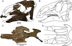 The holotype, MOR 2919, was found in a layer of the Judith River Formation dating from the Campanian and being between 79.8 and 79.5 million years old, plus or minus two hundred thousand years. It consists of a partial skeleton with skull, of an adult individual. It contains the right premaxilla, both maxillae, the left jugal, a part of the right lacrimal, the rear of a left nasal bone, the middle part of a right nasal bone, the skull roof from the frontal bones to the exoccipitals, both squamosals, both quadrate bones, the predentary of the lower jaws, both dentaries, a right surangular, eleven neck vertebrae, eleven back vertebrae, twenty-nine tail vertebrae, nineteen chevron bones, nineteen ribs, the entire pelvis, both lower legs, a right second metatarsal and a right fourth metatarsal. The bones have not been found in articulation.[2]