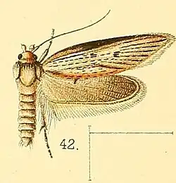 The wingspan of this species is about 26 mm. The forewings are pale cinereous, sparsely sprinkled with elongate fuscous scales, much shaded along the costal margin and on the dorsal margin about the obsolete anal angle with brown and greyish fuscous. There are two small fuscous spots, the first at about half the wing-length, slightly above the middle, the second on the same level beyond it, less than half-way to the apex. The hindwings are greyish cinereous.[2]