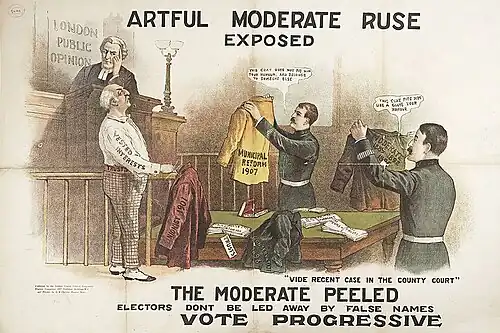 It was founded in 1888 by a group of Liberals and leaders of the labour movement. It was also supported by the Fabian Society, and Sidney Webb was one of its councillors. In the first elections of the London County Council (LCC) in January 1889 the Progressive Party won 70 of the 118 seats. It lost power in 1907 to the Municipal Reform Party (a Conservative organisation) under Richard Robinson.