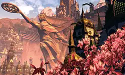 Early concept art was noted for a lack of corners and angles, a conscious artistic and technical choice by Ang to set it apart from other similar games.[21] Pereira described the universe's visual identity as inspired by ancient texts and historical drawings.[3] The original logo was based on the Ouroboros symbol, tying into the game's themes of death and rebirth, but it was dropped due to similarities with the logo of The Elder Scrolls Online.[2] Salvatore created the 10,000 years of backstory and history for the Amalur setting with some friends in a Dungeons & Dragons group, and he worked with McFarlane to ensure his art design matched the story.[10] Salvatore insisted on the backstory's large scope, wanting a cohesive and compelling setting.[22] The game's story, which had a planned four-year arc, would have focused on different factions within Amalur banding together to fight a common enemy.[7][1] A central theme was the social and psychological effects of the Well of Souls, an artifact that grants immortality to Amalur's population.[23] Schilling had been eager to include centaurs as a playable race, but they were left out due to their added workload.[24]