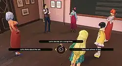 As with previous entries, the gameplay is split between adventure segments where Kamiyama explores Ginza and talks to the characters; and battle segments.[2] A returning gameplay element is the traditional "Live & Interactive Picture System" (LIPS); during conversations, the player is presented with multiple choices to select within a time limit. What response the player selects directly affects Kamiyama's relationship with the protagonists and impacts their later performance in battle segments; Kamiyama's responses also affect supporting non-playable characters (NPCs). The version introduced in this game is "Analog LIPS", in which the player can move the camera around and highlight objects or people to trigger more dialogue.[1][3][4] In one-on-one conversation segments, the player can move the cursor over background elements or the characters to trigger internal monologues and varying responses from the characters.[5] Players may save their game automatically at the start of the adventure and battle parts of each chapter and manually during intermissions and while exploring, which also includes the statuses of the main heroines as well as supporting NPCs.[6]