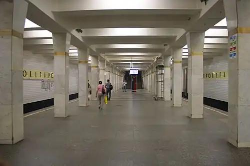 Proletarskaya (Russian: Пролетарская) is a Moscow Metro station in Yuzhnoportovy District, South-Eastern Administrative Okrug, Moscow. It is on the Tagansko-Krasnopresnenskaya Line, between Taganskaya and Volgogradsky Prospekt stations. Proletarskaya opened on 31 December 1966 as part of the Zhadovskiy radius. The station is a typical of the 1960s column tri-span functional design and like many stations built at the time lacks the design and decorative innovations that some of the more famous Moscow Metro stations exhibit. The architects Yuliya Kolesnikova and Yury Vdovin applied a bright theme. The pillars (slightly widening at the top) are revetted with white marble, whilst the floor is covered with grey granite of various tones and with labradorite. The walls are faced with glazed ceramic tiles of white and black (below platform level), which have decorations in the form of hammer and sickles made from anodized aluminium. The station has underground vestibules interlinked with subways under the Krestyanskaya Zastava Square with entrances covered by glazed concrete pavilions. In 1997 a footbridge was built over the northbound line, which serves as a third exit to the common vestibule with the station Krestyanskaya Zastava of the Lyublinsko-Dmitrovskaya Line and also acts as a transfer point. Currently the station has a passenger traffic of 61860 via surface and 120300 via the transfer.