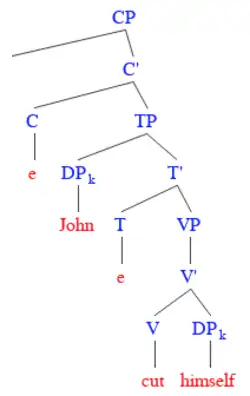 On the other hand, personal pronouns (such as him or them) must adhere to Principle B: a pronoun must be free (i.e., not bound) within its governing category (roughly, the clause). This means that although the pronouns can have a referent, they cannot have a direct relationship with the referent where the referent selects the pronoun. For instance, John said Mary cut him is grammatical because the two co-referents, John and him are separated structurally by Mary. This is why a sentence like John cut him where him refers to John is ungrammatical.