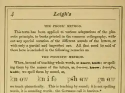 87. ^ Boston Board of Education 1869, p. 171, Superintendent's Report" The method which they recommended is substantially the same as that now practised by most of our Primary teachers. It is what we call the phonic method. It consists in teaching the pronunciation of words by means of the sounds of the individual letters and of certain combinations of two or more letters. The phonic 'print invented by Dr Leigh, is an ingenious contrivance for facilitating the teaching of this method. Leigh's phonic charts and readers have been used in the schools of several districts with marked success. In one school I found extraordinary results produced by a skilful application of the phonic method."