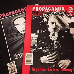 Photographer and journalist Fred H. Berger was inspired to create Propaganda based on his interest in the gothic, industrial, darkwave, occult and fetish subcultures. Berger's official title was not editor-in-chief, but "Propaganda Minister".[2] Between 1991 and 1994 Propaganda produced three videos - The Trilogy mirroring the Holy Inquisition and the Holocaust, Blood Countess chronicling the murderous Countess Elizabeth Bathory, and The Ritual dealing with human sacrifice and black magic.[3] The magazine featured interviews and coverage of music acts such as Bauhaus, Xmal Deutschland, Laibach, Skinny Puppy, Fields of the Nephilim, The Sisters of Mercy, Diamanda Galas, Jesus & Mary Chain, Siouxsie And The Banshees, Coil, Christian Death, Alien Sex Fiend, Swans, Legendary Pink Dots, My Life with the Thrill Kill Kult, Shadow Project, Xymox, Death in June, Dead Can Dance, Front Line Assembly, The Cure, Danzig and Love & Rockets.[2][4][5] Other subjects included articles about the Salem Witch Trials, the Holy Lance, Vlad the Impaler, Joan of Arc, Nazi-fetish chic, the Masque of the Red Death, Oscar Wilde, the Haunted Summer with Lord Byron and Mary Shelley, and queer chic authors Jean Genet and Yukio Mishima. Interviews with favorite goth authors Anne Rice and Poppy Z. Brite were also featured, as well as travel pieces such as "Old Haunts In New Orleans" and "Tokyo A-Go-Go."[2][4]