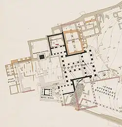 Pausanias records that the inner compartment of the north-east wing was used to display paintings; he calls it οἴκημα ἔχον γραφάς, 'a chamber with paintings',[35] and describes a number of works by masters of the fifth century. By Pausanias' time the picture gallery had been in existence for several centuries, so the Hellenistic historian Polemon of Ilion had written a, now lost, book entitled Περὶ τῶν ἐντοῖς Προπυλαίοις πινάκων 'On the Panel Paintings in the Propylaea' which might have been an influence on the later writer.[36] Satyros, writing in the third century, described two panels dedicated by Alkibiades after his victories in the chariot race at Olympia and Nemea.[37] Also, a painting depicting Diomedes and Odysseus taking the Palladion from Troy, and the painting depicting Achilles on Skyros, painted by Polygnotos around 450 BC. On the basis of these references, modern writers have frequently called the building the Pinakotheke, but there is no ancient authority for that epithet and no reason to believe the building was intended to be a picture gallery.