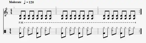 An example of a rhythmic pattern used in heavy metal. The upper stave is a palm-muted rhythm guitar part. The lower stave is the drum part.