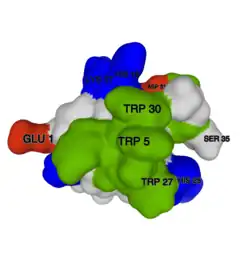 Like other gating-modifier spider toxins, Protoxin-I preferentially binds to anionic lipid-containing membranes where it exhibits complex allosteric interactions with ion channel voltage sensor domains.[9][10] After binding to the lipid membrane, Protoxin-I adopts a shallow position on the anionic membrane with the help of tryptophan residues within the hydrophobic patch,[8] where the positively- and negatively charged rings on the toxin are then able to bind to conserved sequences of hydrophobic and anionic residues on voltage gated ion channels.[11][12]