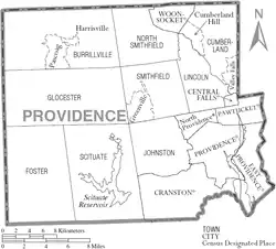 Map of Providence County, Rhode Island showing cities, towns, and CDPs