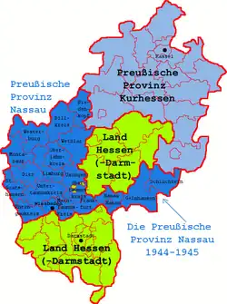 Although all German states (including Prussia) had been de facto dissolved since 1933, the Nazi government formally partitioned the Prussian province of Hesse-Nassau into two provinces with a decree issued on 1 April 1944 and effective on 1 July 1944. The two new provinces were the province of Kurhessen and the province of Nassau.