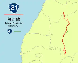 Taiwan Provincial Highway No. 21 is a Provincial Highway in Taiwan that begins at Tianleng (天冷), Dongshi District, Taichung City, at the intersection with Provincial Highway No. 8 (Central Cross-Island Highway), and ends at Tataka(塔塔加), where it is connected with Provincial Highway No. 18 (New Central Cross-Island Highway) in Yushan National Park. It is the primary highway to Sun Moon Lake, a popular tourist destination. The total length is 145 km.[1]