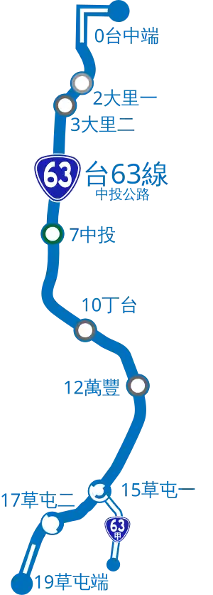 There is a spur (No. 63A) connecting to Bo-ai Road (Provincial Highway No. 14) in downtown Caotun, Nantou. The length of the spur is 2.193 km.