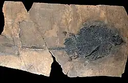 Psephoderma (meaning "pebbly skin", from the Ancient Greek psepho (ψῆφος), "pebbly", and derma (δέρμα), "skin") is a genus of placodonts very similar to the related genera Placochelys and Cyamodus. Psephoderma had a flattened skull and a narrow, straight rostrum, much narrower than that of its relatives. Inside this skull, embedded in the jaws, were rounded teeth specialized for crushing the shellfish it ate. Unlike henodontid placodonts, Psephoderma's carapace was divided into two pieces, one on the shoulders and back, and another on the ventral end. Psephoderma grew to 180 centimetres (5.9 ft) long, larger than many of its relatives,[1] and lived in the Late Triassic (Norian - Rhaetian), about 210 million years ago. It was one of the last placodonts to live. Fossils of Psephoderma have been found in the Rhaetian deposits in the Alps and in England, hence the specific names.[2]