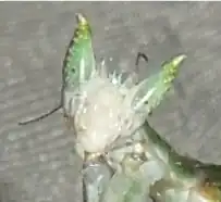Pseudoharpax virescens mimic flowers. They are mostly white with green wings and have pointy eyes. Pseudoharpax virescens are small for a mantis, around 3 centimeters in length as adults. 1st instar nymphs are almost 4 millimeters in length. The color of Pseudoharpax virescens eyes change night to day. At night their eyes are dark red, during the day their eyes are light green. Oothecae can be 5 millimeters to 15 millimeters long.