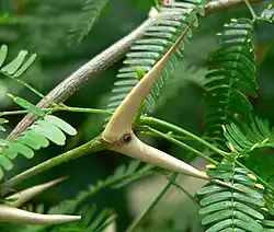 To repel herbivorous animals, various acacias protect their succulent leaves with one of several methods, including vicious-looking spines, repellent, noxious chemicals, and—as is the case with the bullhorn acacia—by developing a mutualism with the acacia ant.[2]