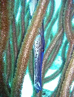 | Trumpetfish (Aulostomus maculatus) hiding in a colony of Pseudoplexaura sp. | |