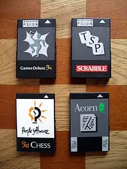 Psion Series 3s have room for two flash-memory cards, which enabled backup of data. Psion, Acorn and third party software was available loaded onto such memory cards which were available as separate packs.