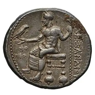 ![]() A coin of Ake (later Ptolemais), depicting Zeus and bearing the Phoenician legend 𐤏𐤊 (ʿK), from the coinage of Alexander the Great | |