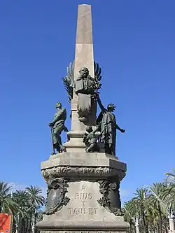 Later, between 1897 and 1901, was built at the entrance to the Parc de la Ciutadella Rius i Taulet Monument, who was mayor during the Exhibition and one of the main promoters of the project designed by the architect Pere Falqués and the sculptor Manuel Fuxà; also participated Eusebi Arnau, author of the figure of Barcelona. The monument consists of a pedestal, which includes both sides of bronze shields representing the four major projects promoted by the mayor: Parc de la Ciutadella, Universal Exhibition, Columbus Monument and Gran Via the Catalan Parliament. The base is an obelisk where the bust of the mayor, surrounded by two figures, one Labour and one allegory of Barcelona, offered a branch of palm. On the back is a winged Fame, and there are also three small geniuses symbolizing Industry, Science and Art.[33]