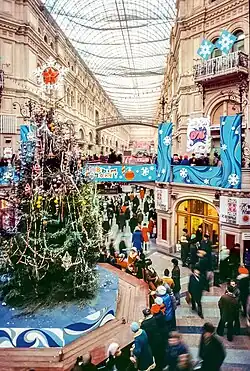 In Soviet Russia, there was a government monopoly on retail, including department stores. The largest government-owned department store in the Soviet Union was Moscow's GUM.[17] Another major government-owned department store was TsUM, which was located across from GUM in Red Square.[18]
