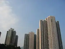 Kwai Fong Estate (Chinese: 葵芳邨) is built on the reclaimed land of Gin Drinkers Bay, later the town centre of Kwai Chung, and the south of Kwai Hing Estate. Kwai Fong station is named from the name of the estate. It comprises 12 buildings with a total of 6400 units and 1 shopping arcade. Before redevelopment, it consisted of 11 buildings which were completed between 1971 and 1973. In 1982, the buildings were revealed to have structural defects.[21] In 1985, the HKHA announced that the strength of the concrete in blocks 8, 9, 10 and 11 of Kwai Fong Estate was below standard. Those blocks were demolished between 1985 and 1989.[22] Other old buildings were also demolished in the 1990s to cope with the estate redevelopment. The estate was later redeveloped with 12 new buildings built between 1987 and 2002.