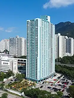 Chung On Estate (Chinese: 頌安邨) is the fourth public housing estate in Ma On Shan.[5][6] It is built on the reclaimed land approaching Sha Tin Hoi and Tolo Harbour.[7] It consists of 5 residential blocks completed between 1996 and 2001, offering a total of 3,000 units. Besides, there is a shopping mall (Chung On Shopping Centre) inside of the housing estate.