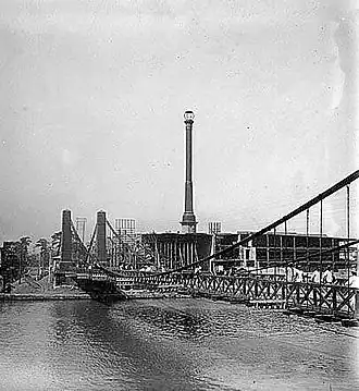 The Puente Colgante (lit. 'Hanging Bridge'), originally called Puente de Clavería (lit. 'Clavería Bridge'), was a suspension bridge that connected the Manila districts of Quiapo and Ermita across the Pasig River in the Philippines. Designed by Matia, Menchacatorre and Cía. and completed in 1852, it was the first modern wire-cable suspension bridge in Asia and the first toll bridge of its kind in the Philippines.[1] It was replaced by the Quezon Bridge in 1939.