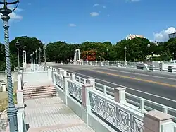 The bridge's architectural style follows the Art Deco tradition. It has 16 lampposts, 8 on each side, and is covered with marble.[24] The bridge's main span material is steel and its main span design is stringer/multi-beam or girder. The deck is cast-in-place concrete with a Monolithic Concrete wearing surface (concurrently placed with structural deck).[25] It has an 89.6 feet span length, and 93.5 feet total length.[26] The bridge was designed by architect Ilia Sánchez Arana, who also designed Paseo Arias, a.k.a., Callejón Amor, in downtown Ponce.[27]