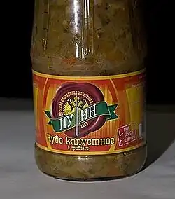 Puin (Russian: Пуин) also spelled PuTin (Russian: ПуТин) is a brand of vegetable and mushrooms canned goods produced by Astrakhan Canned-food Plant (Astarkhanskiy Konservniy Kombinat) and its parent company Russian Canned-food Plant (Russkiy Konservniy Kombinat). The official name of the brand is Puin but the logo is crossed by the T-shaped sword (a KGB symbol) making the impression that the brand is PuTin, similar to the name of Russian President Vladimir Putin. The logo is put on the background of a Double-headed eagle very similar but not identical to the Coat of arms of Russia. The official logo was developed in 2007 to compete with Ukrainian brand Veres that had then approximately 70% share of all the canned food sold in Russian supermarkets. According to the owners of the trademark the logo increased their sales in a short time by 25%.[1][2]