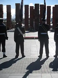 The Australian memorial, designed by Australian architects Tonkin Zulaikha Greer, commemorates the significant military relationship between Australia and New Zealand. The memorial consists of fifteen red sandstone columns with various inscriptions and artworks by both Aboriginal and Māori artists.[4] The memorial was opened in April 2015 by Australian Prime Minister Tony Abbott and New Zealand Prime Minister John Key.[5]