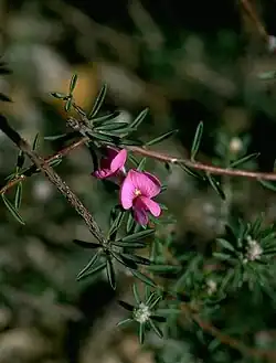 Pultenaea subalpina, commonly known as rosy bush-pea,[2] is a species of flowering plant in the family Fabaceae and is endemic to a restricted area of Victoria. It is a rigid, prostrate to erect or spreading shrub with linear leaves and pink, pea-like flowers.