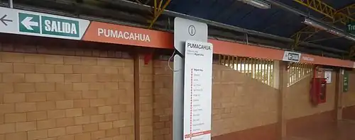 Pumacahua is a Lima and Callao Metro station on Line 1. The station is located between Parque Industrial and Villa María. It was inaugurated on 28 April 1990 as part of the first section of the line between Villa El Salvador and Atocongo. However, commercial service only started on 18 January 2003, was suspended in July 2003 due to the lack of funds, and resumed only on Saturdays and Sundays on 17 January 2004. The full revenue service started on 3 January 2012, with trains running to Miguel Grau.[1][2]
